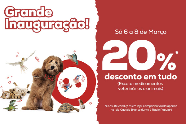 Para celebrar de 6 a 8 de março, terá um desconto de 20% em tudo (não incluindo medicamentos veterinários e animais).