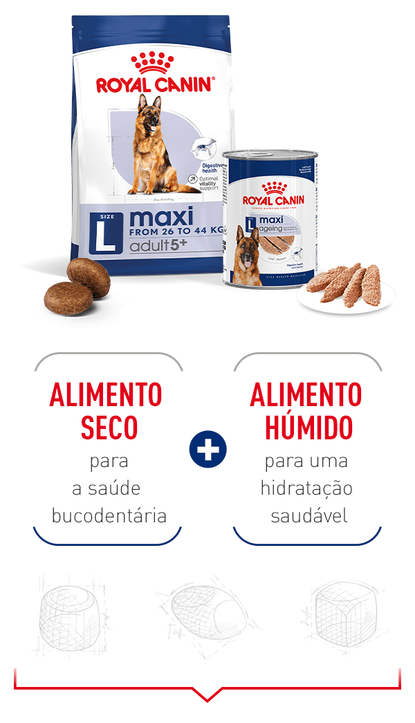 Alimento húmido para cães de raças grandes a partir dos 5 anos de idade.