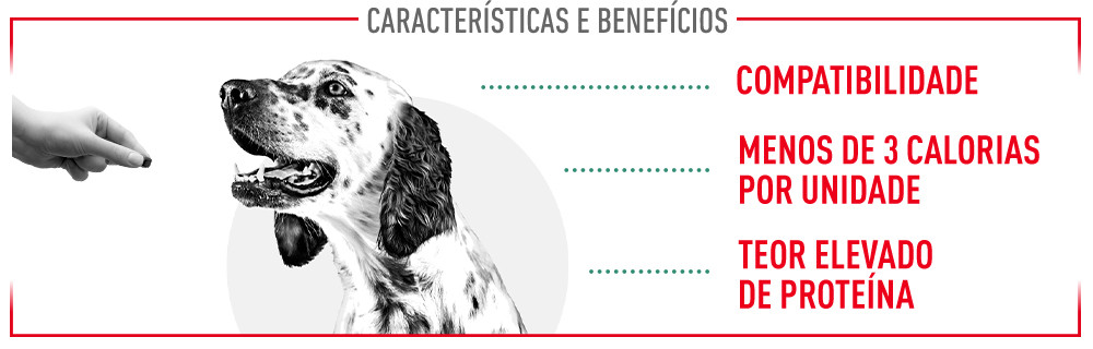 Royal Canin Treats Satiety satisfatórios para cães com uma textura macia são compatíveis com dietas de controlo de peso porque são baixos em calorias e ricos em proteínas, o que os torna ideais como um snack saudável.